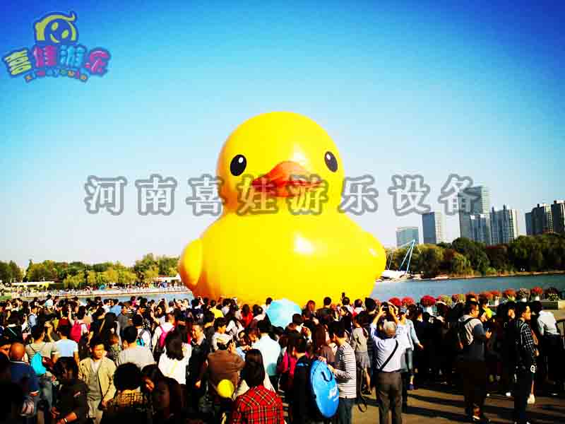 游乐设备大黄鸭是属于一款造型比较大的充气类游乐产品。整体造型跟产品名称一样,就是一个很大的鸭子造型。基本上都是设置在各种景区的水面上,不过这款设备并不是作为游乐的设备,它只是作为观赏用的,并且由于它足够大,很多景区都拿他当做地标性产品,很多游客第一次见的时候都会感叹一声:好大的鸭子。很多景区水面都配备此类产品,来吸引人们都眼球,是水面上一道亮丽的风景线。